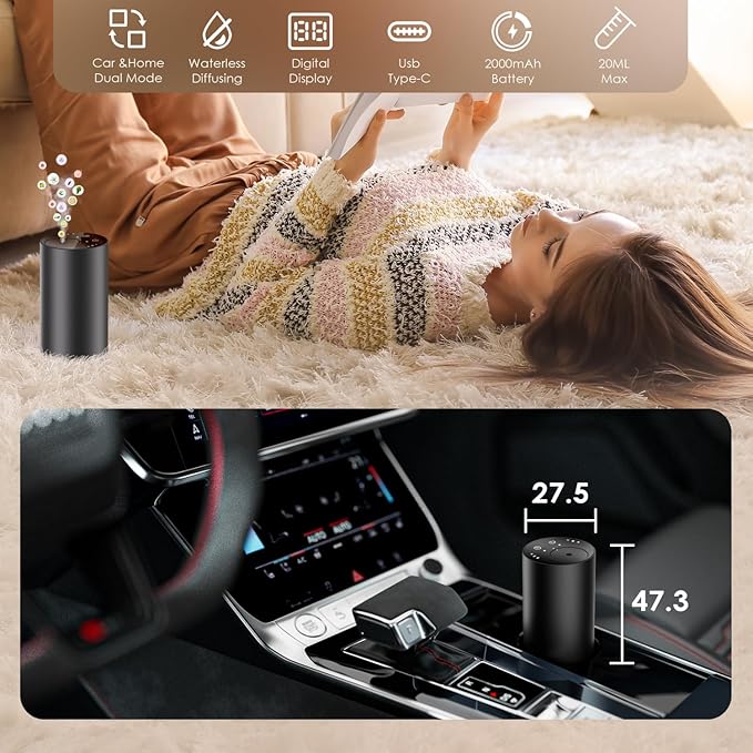• Wide Coverage & Compact and Efficient: The Diffuser for Essential Oils can cover an area of up to 800 sq. ft and operates efficiently in large spaces. It effectively eliminates and masks unpleasant odors in areas such as pet rooms and bathrooms. Note: Please do not turn the Car Air Freshener Diffuser upside down to avoid leakage; this design feature enhances fragrance evaporation.