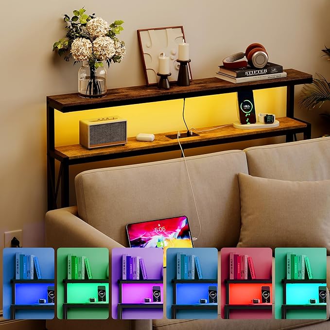 FAVOOSTY 5.9" Narrow Console Table with Led Light and Charging Station 46.8" Behind Couch Table Skinny Sofa Table with Power Outlets for Living Room, Hallway, EntryWay, Rustic Brown&Black