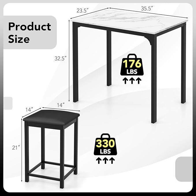 • [3-Piece Bar Table Set]: Elevate your space with this premium bar table set, including a counter-height table and 2 bar chairs. Both the table and chairs feature sturdy metal legs for long-lasting reliability. Dining table weight capacity: 176 lbs, Dining chair weight capacity: 330 lbs each.