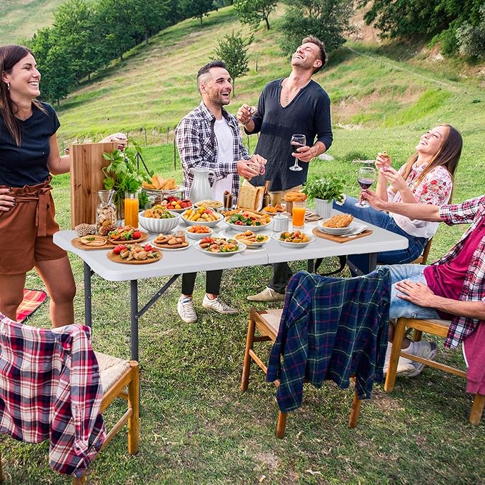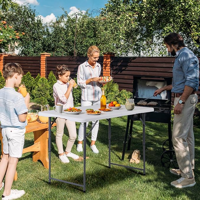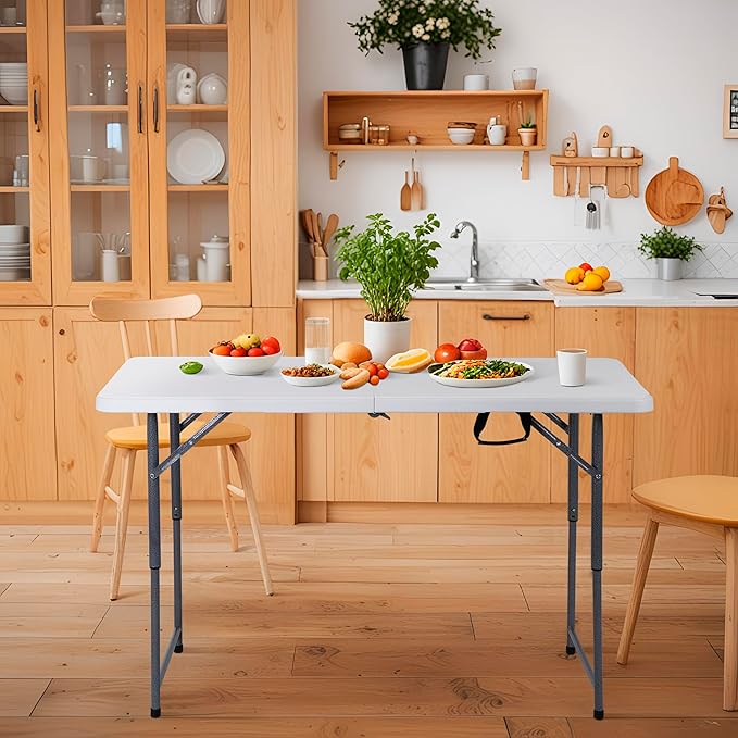 • 【Foldable & Portable】-- No assembly required. This 4 foot folding table folds in the center, locks closed, and is compact and easy to store. Comes with a comfortable carry handle for better portability. You can put the folding table in the trunk, and then go on a picnic trip with your friends.