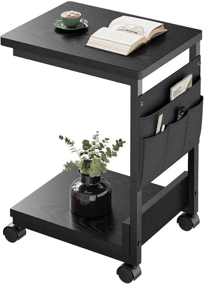 Side Table,C Table with 2-Tier Storage Shelf, End Table with a Storage Bag, Sofa Table with Wheels for Living Room, Bedroom, Office, Bathroom, Black