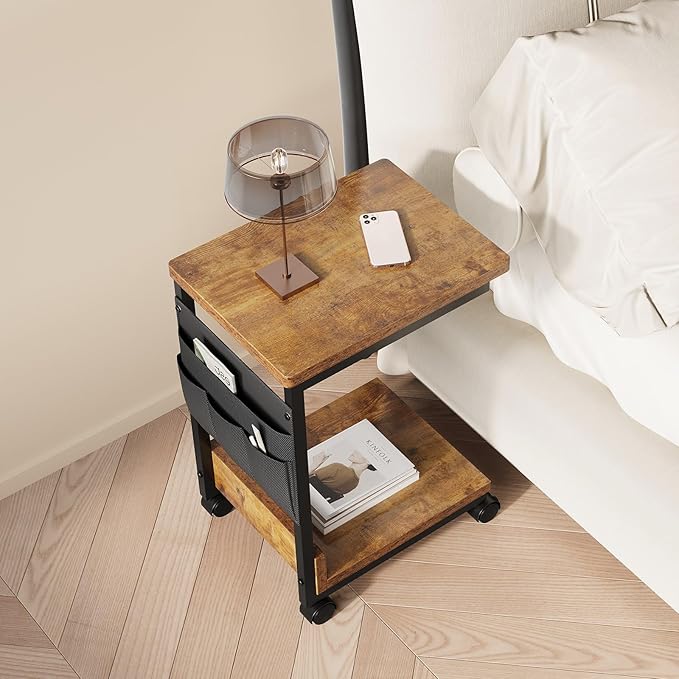 Side Table,C Table with 2-Tier Storage Shelf, End Table with a Storage Bag, Sofa Table with Wheels for Living Room, Bedroom, Office, Bathroom, Rustic Brown