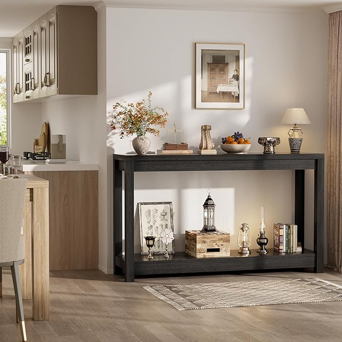47" Farmhouse Wood Entryway Table Narrow Console Table with Storage Behind Couch Sofa Table with Shelves for Entry Way with Open Storage, Easy Assembly, Embossed Wood Grain Black