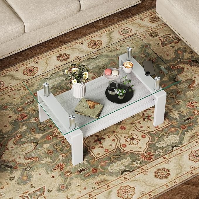 • Two-Tier Storage Design – Measuring 39.2"L x 23.4"W x 17.7"H, the rectangular glass coffee table features a practical dual-layer structure. Use the lower shelf to neatly store magazines, books, or decorative items