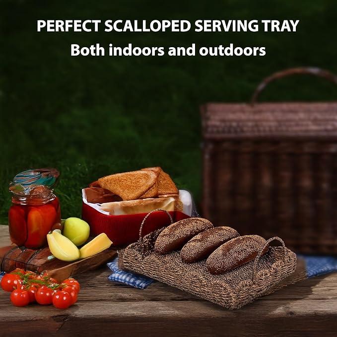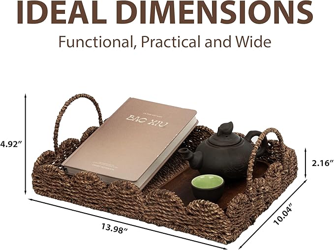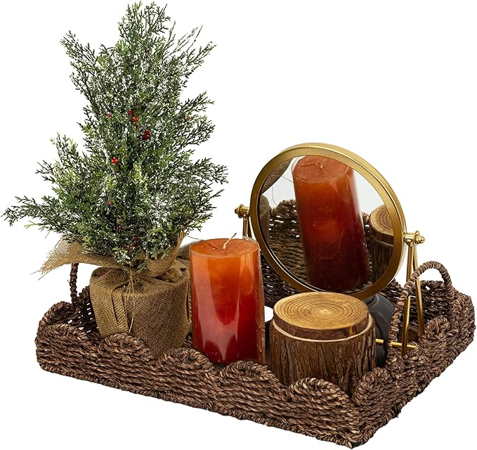• 𝐆𝐢𝐟𝐭-𝐑𝐞𝐚𝐝𝐲 𝐁𝐚𝐬𝐤𝐞𝐭 𝐟𝐨𝐫 𝐄𝐯𝐞𝐫𝐲 𝐎𝐜𝐜𝐚𝐬𝐢𝐨𝐧: Measuring 14" x 10" x 2.16", this brown wicker basket tray makes a thoughtful gift for birthdays, weddings, or holidays. A trending mud pie scalloped tray alternative that works as a Christmas tray for coffee table or small wicker tray for any space.