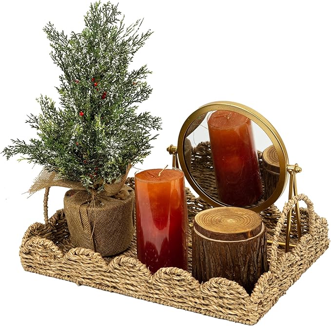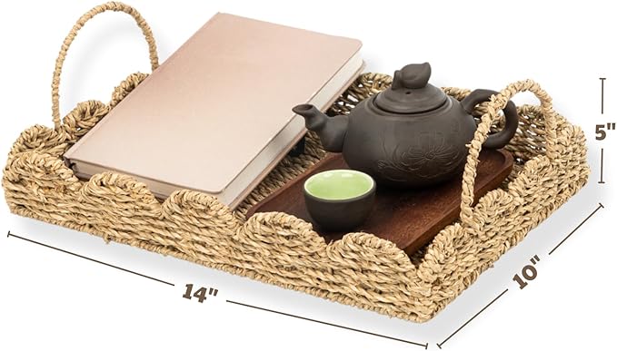 • 𝐆𝐢𝐟𝐭-𝐑𝐞𝐚𝐝𝐲 𝐁𝐚𝐬𝐤𝐞𝐭 𝐟𝐨𝐫 𝐄𝐯𝐞𝐫𝐲 𝐎𝐜𝐜𝐚𝐬𝐢𝐨𝐧: Measuring 14" x 10" x 2.16", this brown wicker basket tray makes a thoughtful gift for birthdays, weddings, or holidays. A trending mud pie scalloped tray alternative that works as a Christmas tray for coffee table or small wicker tray for any space.
