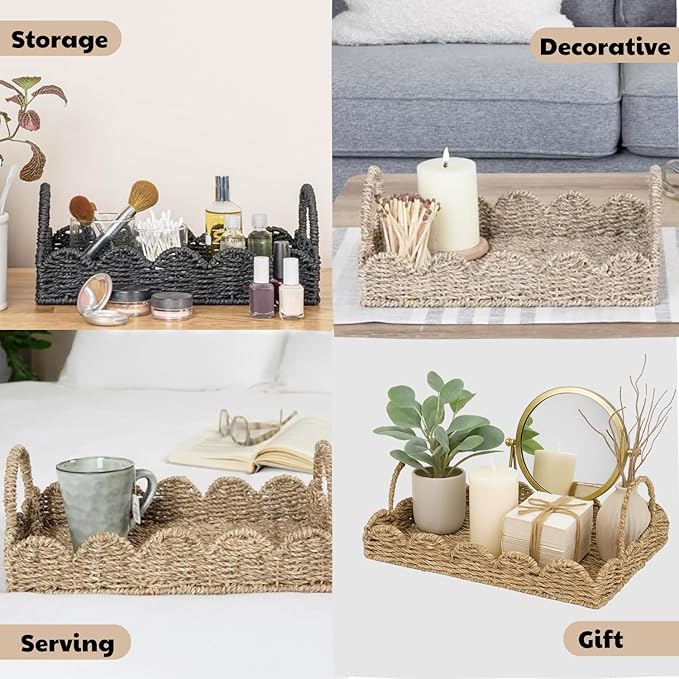 • 𝐒𝐭𝐲𝐥𝐢𝐬𝐡 𝐁𝐨𝐡𝐨 𝐓𝐫𝐚𝐲 𝐰𝐢𝐭𝐡 𝐒𝐜𝐚𝐥𝐥𝐨𝐩𝐞𝐝 𝐄𝐝𝐠𝐞 𝐃𝐞𝐬𝐢𝐠𝐧: Inspired by coastal and boho tray aesthetics, this scalloped basket with elegant curves adds texture to your coffee table decor, ottoman tray, or kitchen counter. Ideal for spring, summer, and everyday styling in coastal grandma decor homes.