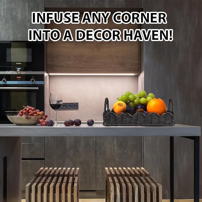 • 𝐒𝐭𝐲𝐥𝐢𝐬𝐡 𝐁𝐨𝐡𝐨 𝐓𝐫𝐚𝐲 𝐰𝐢𝐭𝐡 𝐒𝐜𝐚𝐥𝐥𝐨𝐩𝐞𝐝 𝐄𝐝𝐠𝐞 𝐃𝐞𝐬𝐢𝐠𝐧: Inspired by coastal and boho tray aesthetics, this scalloped basket with elegant curves adds texture to your coffee table decor, ottoman tray, or kitchen counter. Ideal for spring, summer, and everyday styling in coastal grandma decor homes.