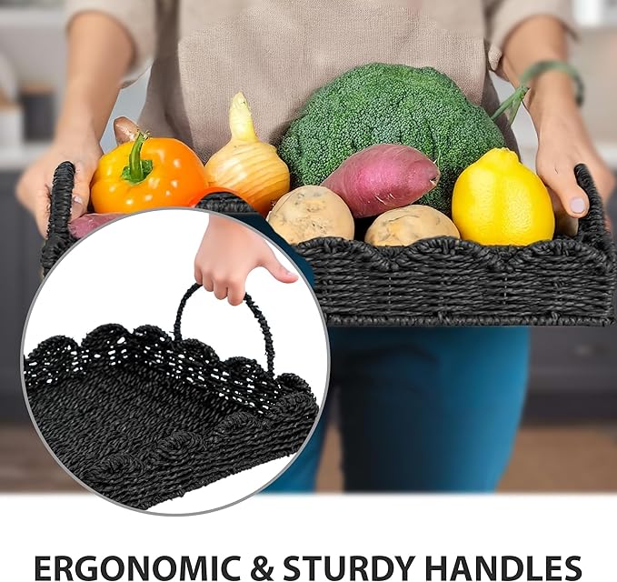 • 𝐅𝐮𝐧𝐜𝐭𝐢𝐨𝐧𝐚𝐥 𝐁𝐚𝐬𝐤𝐞𝐭 𝐓𝐫𝐚𝐲 𝐰𝐢𝐭𝐡 𝐇𝐚𝐧𝐝𝐥𝐞𝐬: This basket tray with handles is built for easy carrying indoors and outdoors. Use it as a serving tray, coffee tray, or table tray for snacks, drinks, and decorative items with comfort and ease.