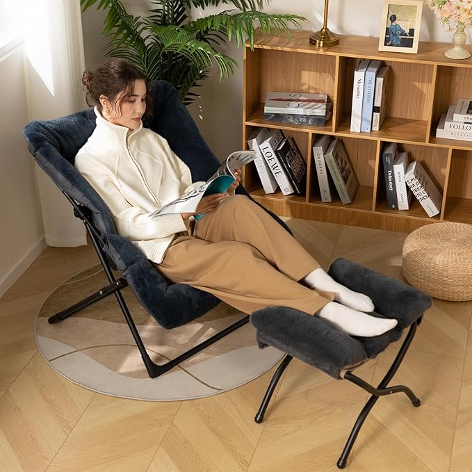 HollyHOME X-Large Saucer Chair with Foldable Ottoman, Comfy Oversized Folding Chair and Folding Footrest Stool Set, Faux-Fur Reading Chair and Footstool for Living Room, Navy Blue Chair&Stool