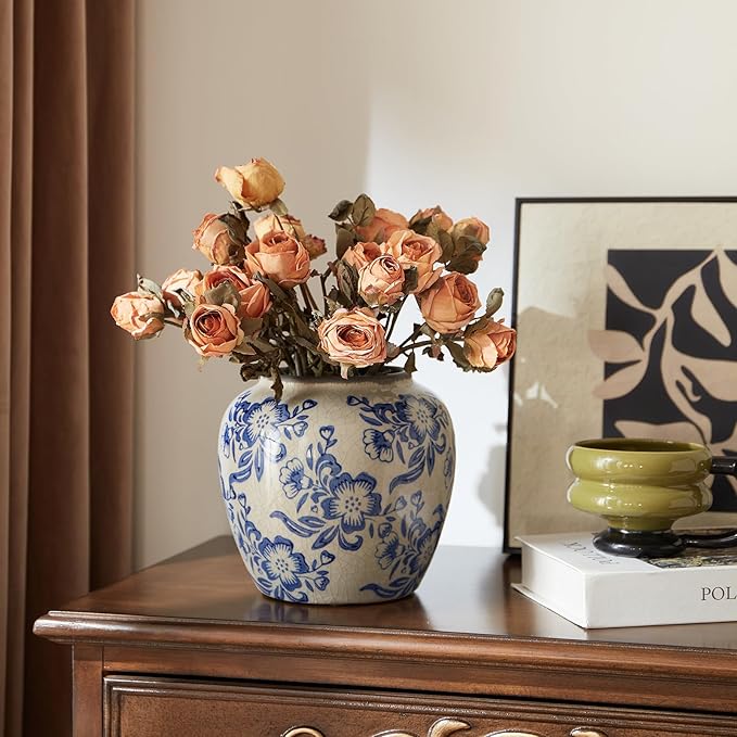 Blue and White Vases, Ceramic vases for Home Decor, Farmhouse Flower vase, Blue vase for Living Room Decor, Vintage Vase for Console Table Mantle Chinoiserie Decor