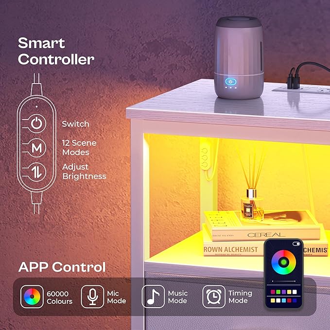 • 【Nightlight or for Room Ambiance】With a smart controller, choose from 12 scene modes, 5 adjustable speed levels, and 3 brightness settings or smartphone app with over 60,000 colors, set timers, music and mic mode. Whether you need a gentle nightlight or want to create the perfect mood, this LED nightstand’s LED lights offer versatile lighting options that give room just the right amount of light to sleep with