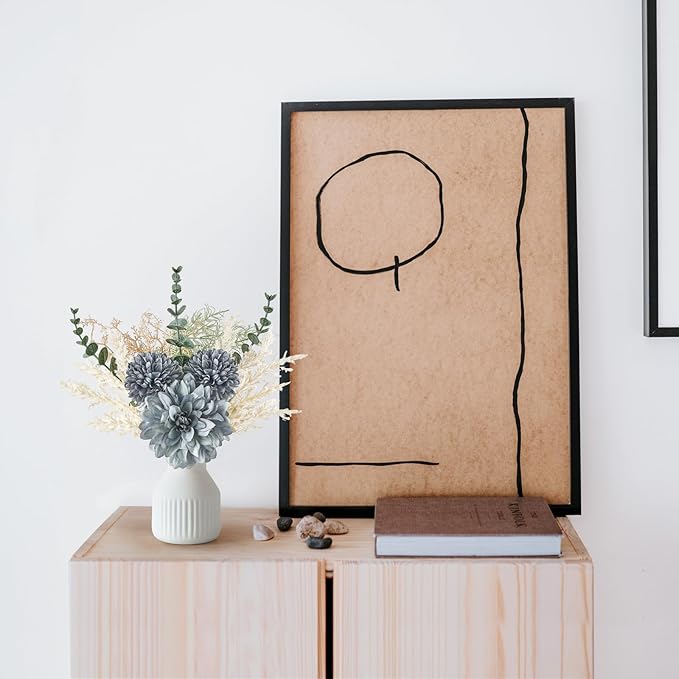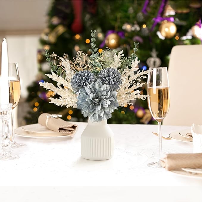 • Small Faux Flowers in Vase: The artificial flowers for decoration include fake dahlia, dandelion, eucalyptus plants, and a matte white ceramic vase with vertical stripe. Putting the fake flower bouquet in the vase will create a poetic atmosphere, suitable for table centerpieces, coffee table decor, farmhouse decor, living room decorations