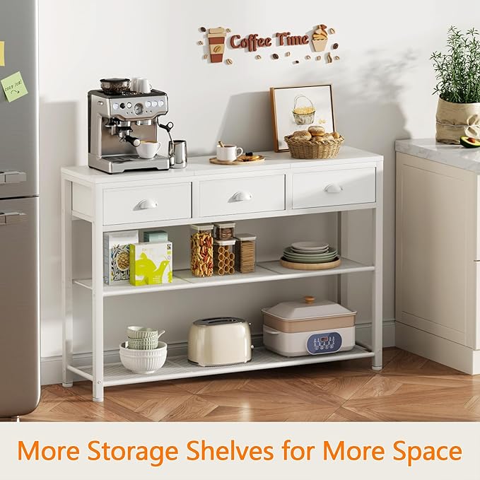 Furologee White Entryway Table, 38'' Console Sofa Table with 3 Fabric Drawers, Industrial Entry Way Table with Storage Shelves, Display Shelf for Living Room, Hallway, Entrance, Foyer