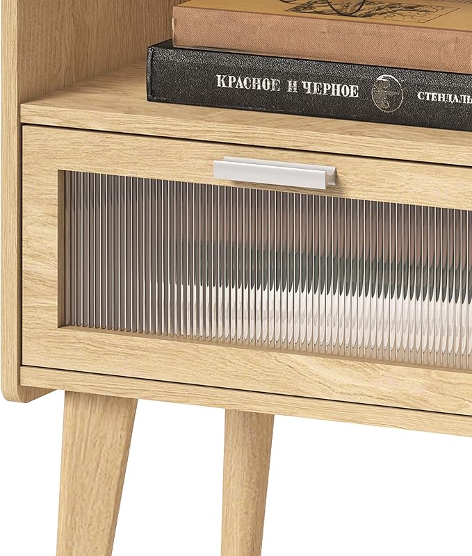 Nightstand with Charging Station, Bedside Tables with Glass Decorative Door, Natural End Table, Side Table with 2 Tiers Storage Space for Bedroom Living Room CAMLBZ07YE
