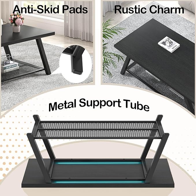 • Sturdy Build & 2-Tier Open Storage: Made with premium MDF top and strong metal legs, this living room table supports up to 300 lbs. The open 2-tier design includes an iron mesh shelf, perfect for storing books, remotes, or baskets