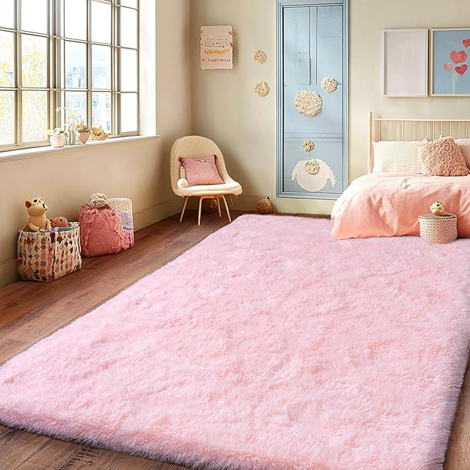 Pink Rug for Living Room, 9x12 Area Rug for Cute Girls Room, Bedside Indoor Floor Fluffy Shag Carpet, Plush Soft Rug for Bedroom Nursery Dorm Home Decor