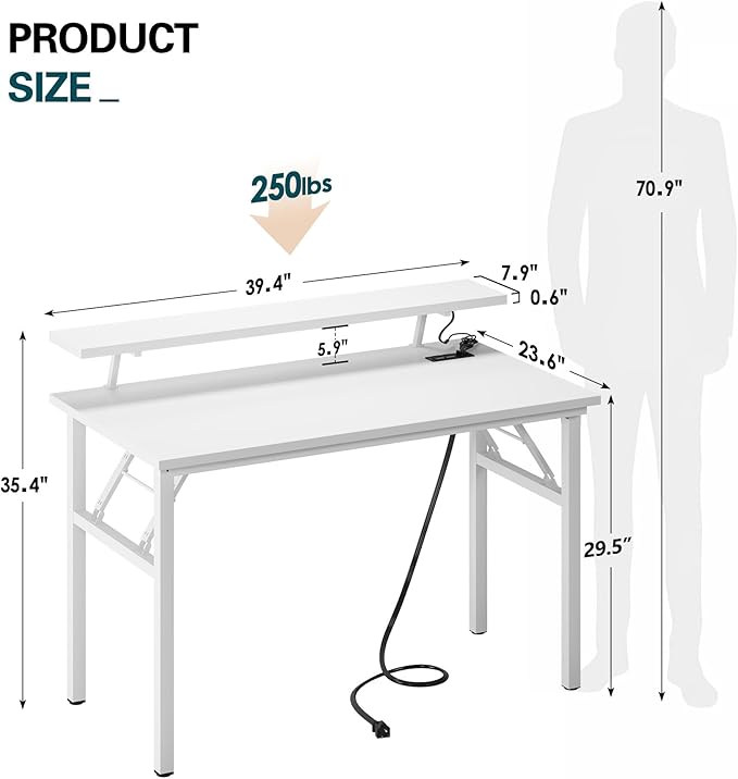 DlandHome Computer Desk 39’’ with LED Lights & Power Outlets,Folding Desk with Monitor Stand, Writing Desk Home Office Desk, Fully Assembled,White