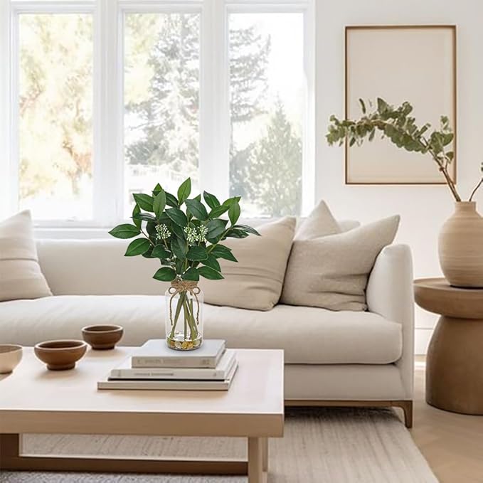 • Eye-Catching Home Decor: Transform your space with this stunning artificial laurel arrangement in glass vase. The lifelike leaves and crystal-clear faux water create a fresh, natural vibe, perfect for farmhouse, modern, or boho styles. Ideal for tables, shelves, or desks