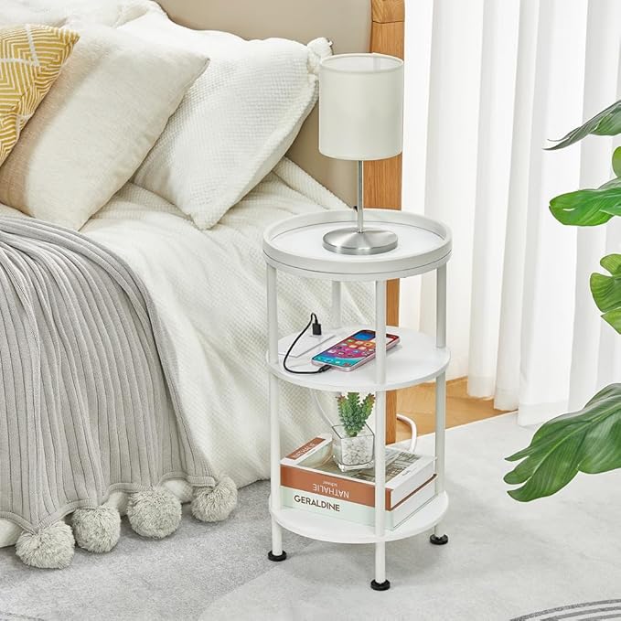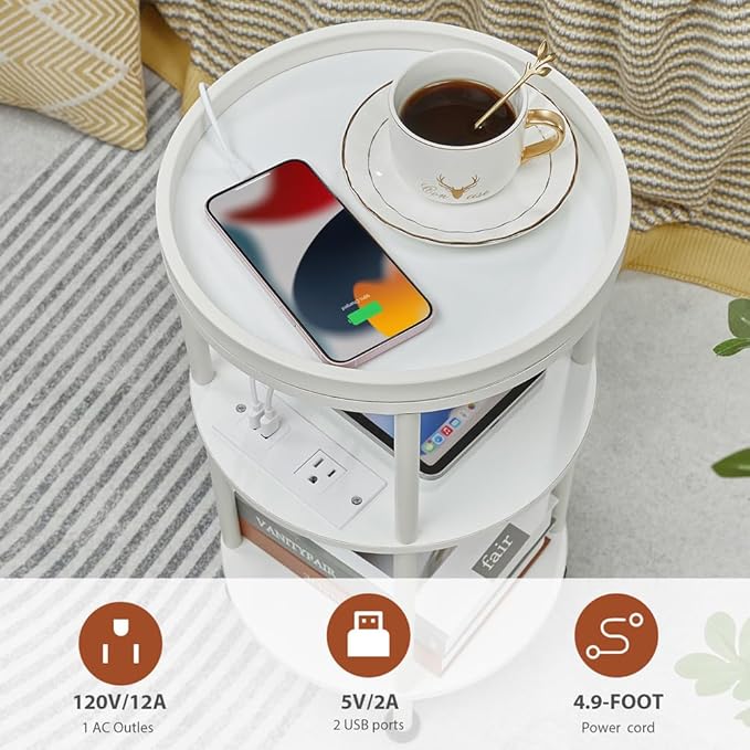 Small Round End Table with Charging Station, 3-Tier Accent Couch Beside Table with USB Ports & Power Outlets, Sofa Side Table for Living Room Small Nightstand Bedroom (USB Charger, White)