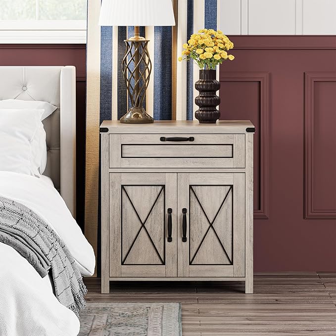 • 【Wooden Farmhouse Nightstand】Combining farmhouse and modern for all styles of home decor, it's the perfect way for adding personality and charm to your bedroom, living room and other small spaces.Whether you are a fan of a modern style or a lover of a vintage feel, this night stand will be a perfect match to your room decor and show your personal style and will catch your eyes for the fashion barn door design, classic farmhouse style, sturdy structure.