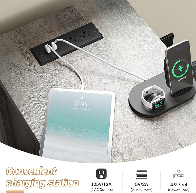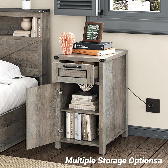Maupvit End Table with Charging Station, Farmhouse End Table Narrow Side Table for Living Room, Sofa Side Table with Drawer and Storage Cabinet, Small Nightstand for Bedroom (Retro-Grey)