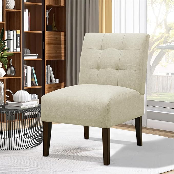 Slipper Accent Chair Modern Armless Lounge Chair with Wood Legs Upholstered Makeup Vanity Tufted Side Chair Fabric Comfy with Decor Back for Living Room Bedroom Patio (Pin Back, Beige)