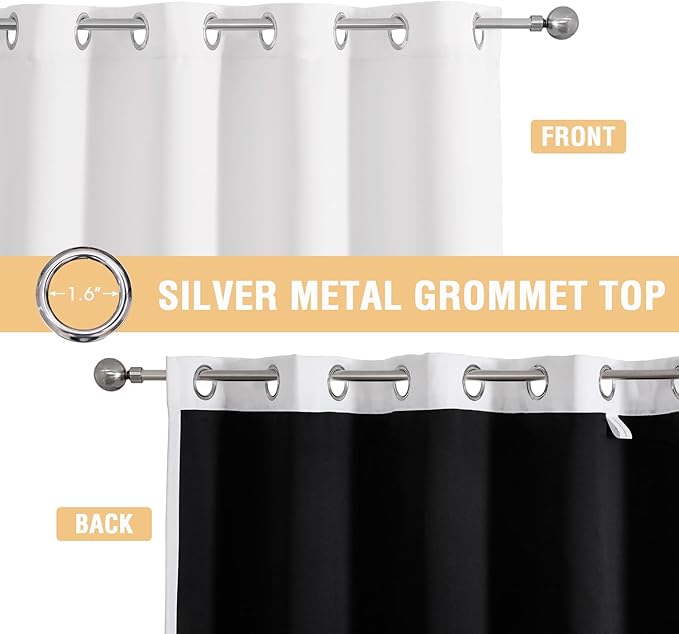 • SET DETAILS: Set of 2 total blackout curtain panels per package. Each lined curtain measures 38 inch wide by 63 inch long with 6 silver metal grommets (1.6 inch inner diameter) on top, easy to install and slide.