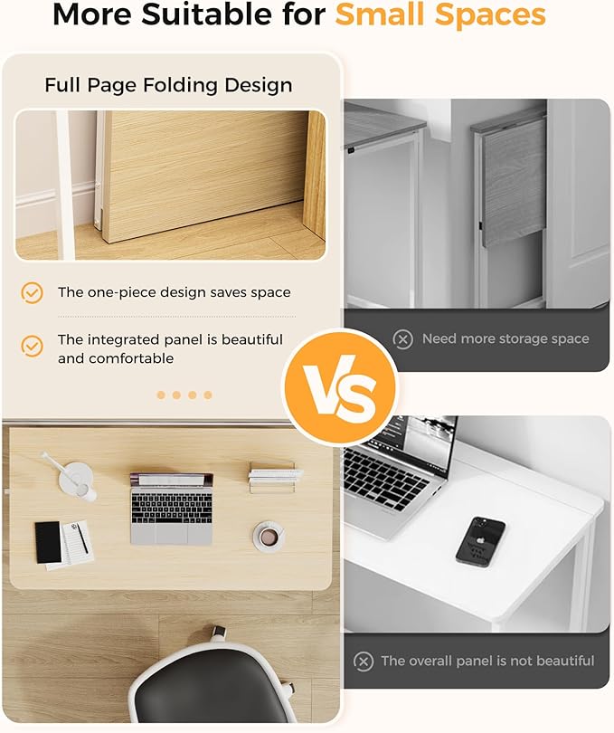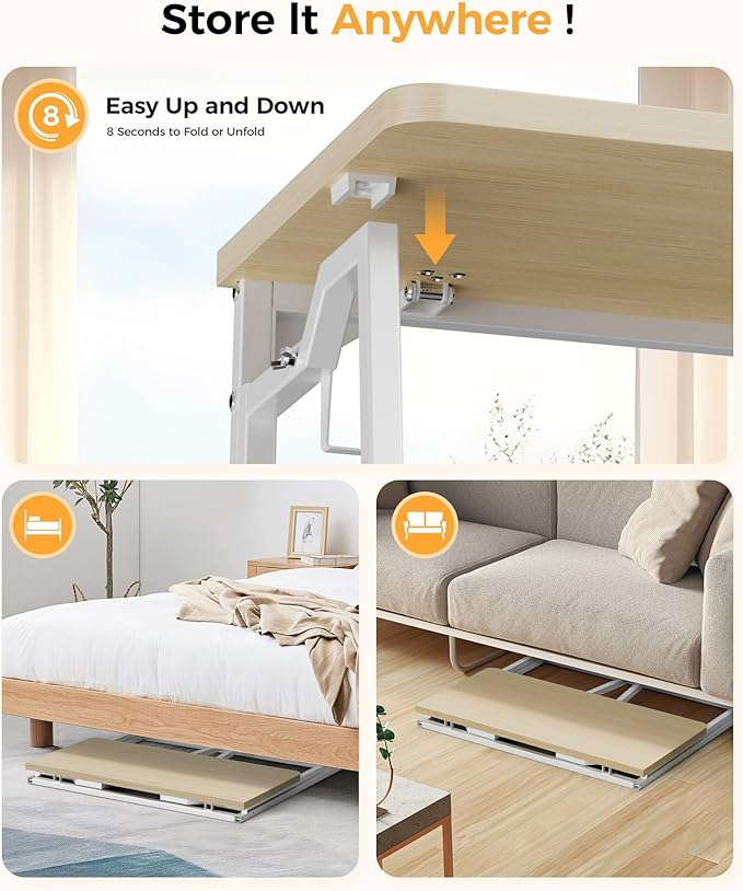 • EASY TO STORE: the desktop adopts a new type of table board, which is not separated,The entire desktop can be folded directly for storage, the product size is 2.6 inches deep x 31.5 inches wide x 29.5inches when folded,It can be easily stored in corners, gaps, etc, when not in use to keep the room tidy