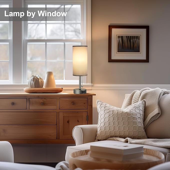 • 1. 3-Color Temperature Bedroom Lamp - The small grey table lamp for bedroom features with stylish pull-chain to make quick changes to 3 different level brightness (3000K, 4000K, 5000K ). Simply give the string a little tug when you want the nightstand lamp On/Off, brighter/dimmer, 3000K for Used as a night lamp, 5000K for reading/study