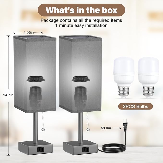 • 4. Plug and Play Chic Bedroom Lamps Set: Package included 2pcs non-flicker FREE E26 led light bulb (worth $15), 2pcs install-free square cream flaxen fabric shade, 2pcs stable lamp body and classic black metal base. Put all together for a minimalism classic lamp is really perfect to decorate anywhere of your house. An ideal tableside lamp for bedroom, guest room, living room, study room, kids room, college dorm room for girls and boys, office room, desk, etc