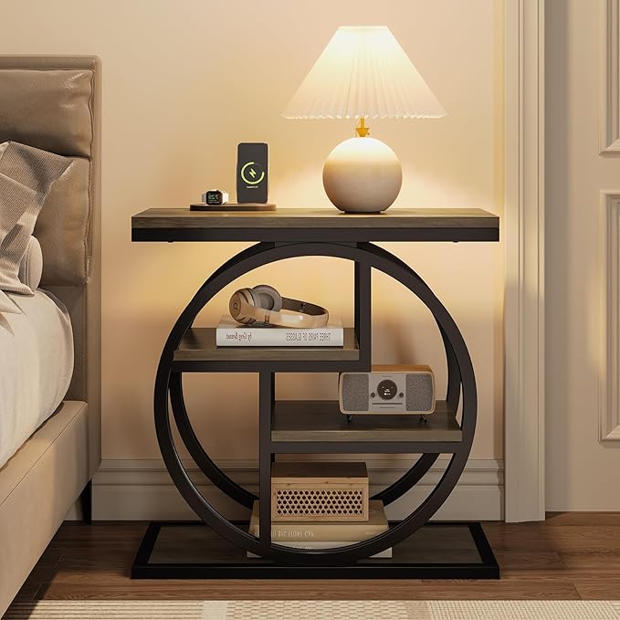 Tribesigns End Table for Living Room, 4-Tier Narrow Side Table with Storage Shelves, Industrial Bedside Table for Bedroom, Wood Small Sofa Side Table with Geometric Metal Frame (1 PC, Grey)