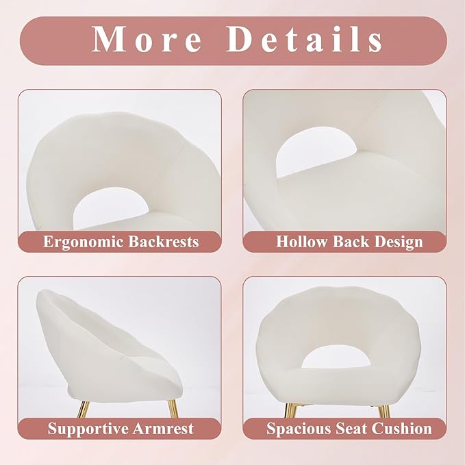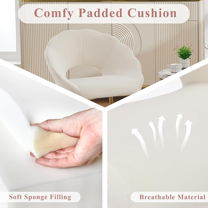 • 【Vanity Chair with Hollow Back】 This velvet chair has a curvy petal shape and a rustic light color that gives it a warm, modern aesthetic. The U-shaped arms give the chair a striking look, and the slightly sloped back makes it easy to sink into.