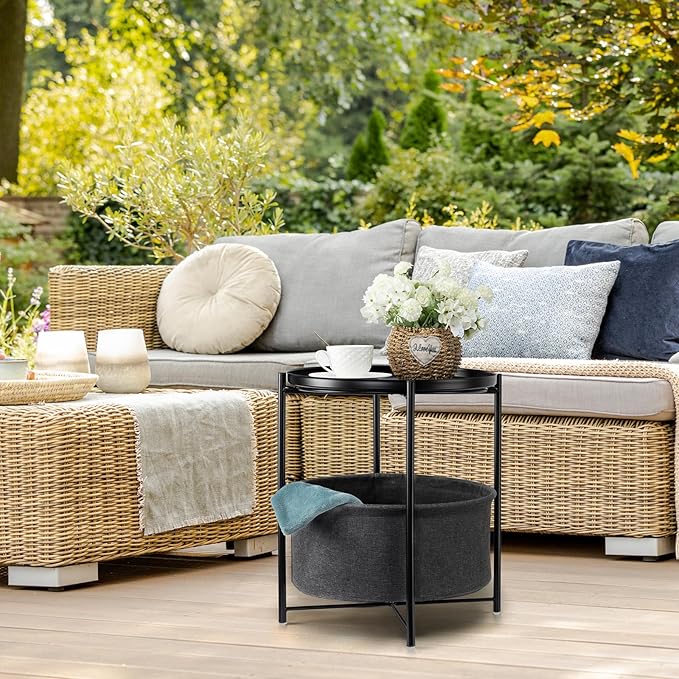 danpinera Round Side Table with Fabric Storage Basket, Metal Small Bedside Nightstand Removable Tray Top for Living Room, Bedroom, Nursery, Laundry, Ink Black