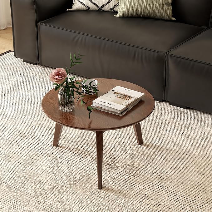 100% Solid Oak Wood Mini Coffee Table, Round Cofffe Tables Side Table w/Solid Wood Legs, Walnut Mid Century Table for Bedroom Balcony Living Room (23.62" D x 13.78" H)