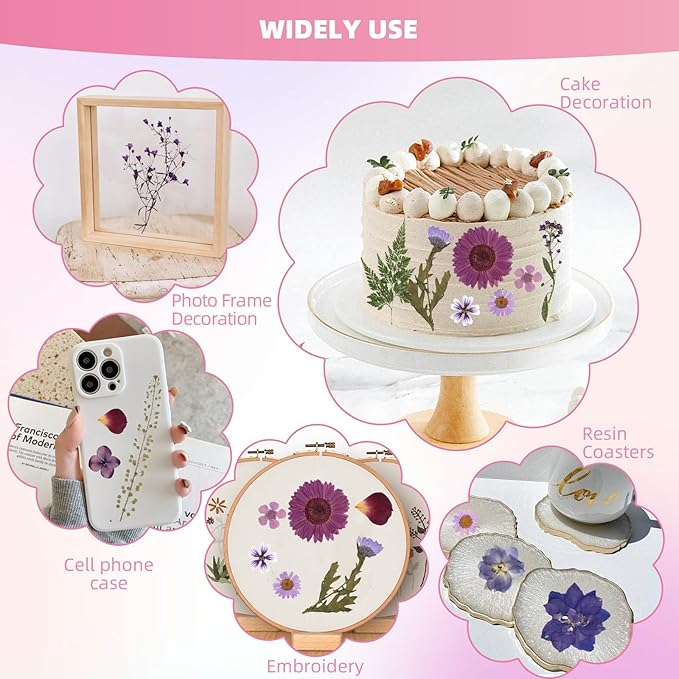 • Wide Range of Applications: Dried flowers can be used in a wide range of crafts applications, such as for glass or wooden photo frames , greeting cards, scrapbooks supplies, epoxy resin projects (such as nails, jewelry, phone cases, bookmarks, coasters, trays), candles, aromas, soap making materials, facial decorations, cake decorations, furniture wooden products, and decorative surfaces for glass and ceramics. Unleash your creativity and enjoy the freedom to create unique projects.
