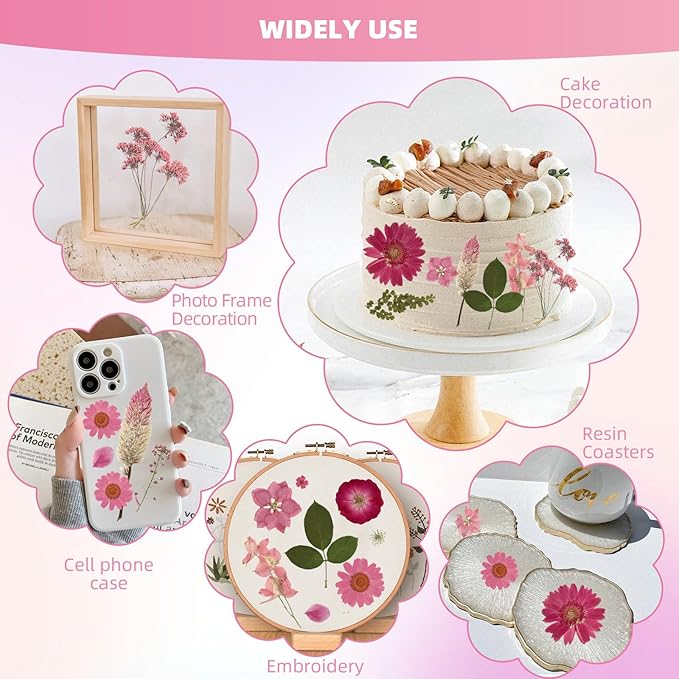 • Wide Range of Applications: Dried flowers can be used in a wide range of crafts applications, such as for glass or wooden photo frames , greeting cards, scrapbooks supplies, epoxy resin projects (such as nails, jewelry, phone cases, bookmarks, coasters, trays), candles, aromas, soap making materials, facial decorations, cake decorations, furniture wooden products, and decorative surfaces for glass and ceramics. Unleash your creativity and enjoy the freedom to create unique projects.