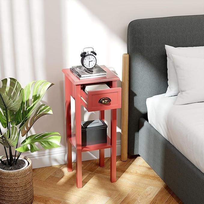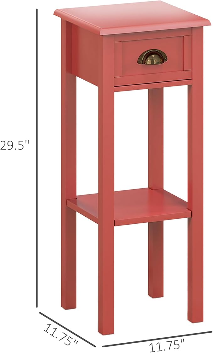 HOMCOM 2-Tier Side Table with Drawer, Narrow End Table with Bottom Shelf, for Living Room, Set of 2, Red