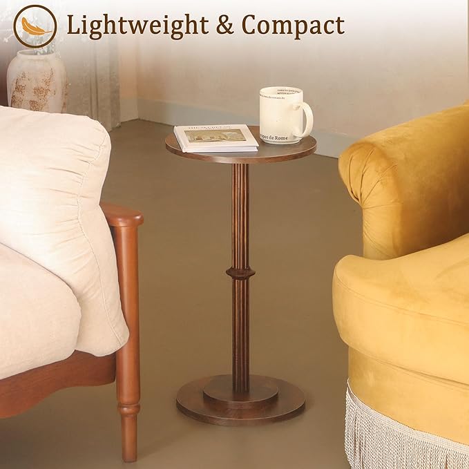 MaxSmeo Drink Table, Small Side Table for Small Spaces, Modern Round End Table with Fluted Wood Leg, Rustic Brown
