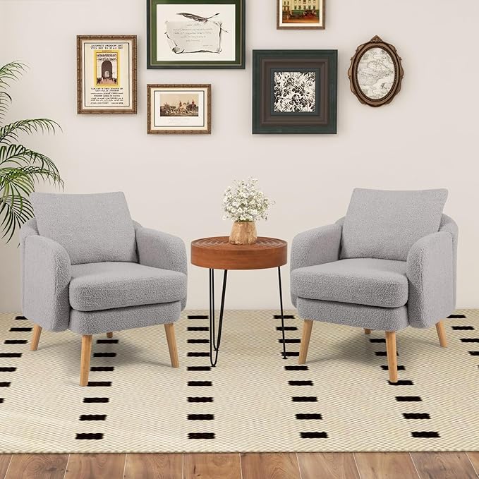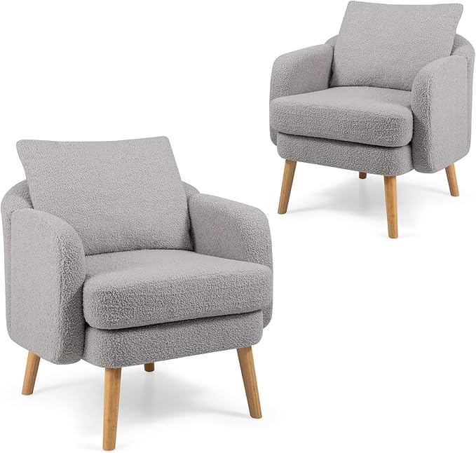 Giantex Sherpa Accent Chair Set of 2, Modern Upholstered Single Sofa Chair with Back Pillow & Solid Rubber Wood Legs, Teddy Barrel Arm Chair for Reading, Living Room, Bedroom, Office, Grey