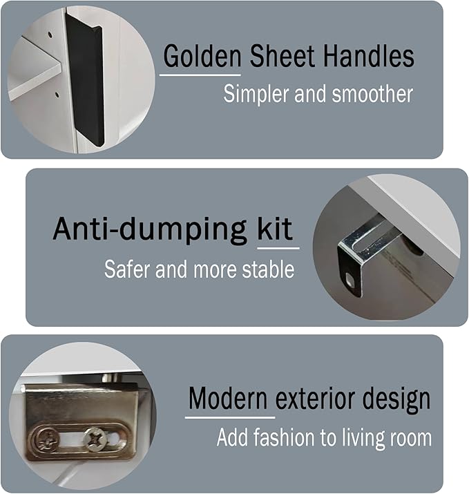 • Prominent Appearance and Design:Modern Aesthetic Matches Urban Decor,as a entryway console table,elevate your entryway with clean lines and minimalist design.With 2 drawers and open shelf,this console table creates the easier and convenient space saving for key,magazines, glasses, cosmetics or other items.White console table features golden sheet handles with anti-dumping kit, that is smoother and safer for home use.