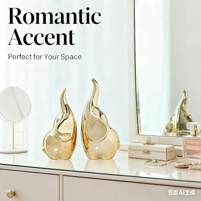 • [Symbol of Love and Loyalty] These gold ceramic elephant figurines beautifully symbolize love, loyalty, and good fortune. Designed as a couple with trunks raised high, these elephants convey a timeless story of unity and prosperity. Crafted in a minimalist style, the smooth ceramic finish adds a modern elegance, making them perfect for elephant decor for home or elephant sculptures for home decor. Their compact sizes—5.5 inches (14 cm) and 4.72 inches (12 cm)—make them an ideal fit for shelves, desks, or bedside tables.