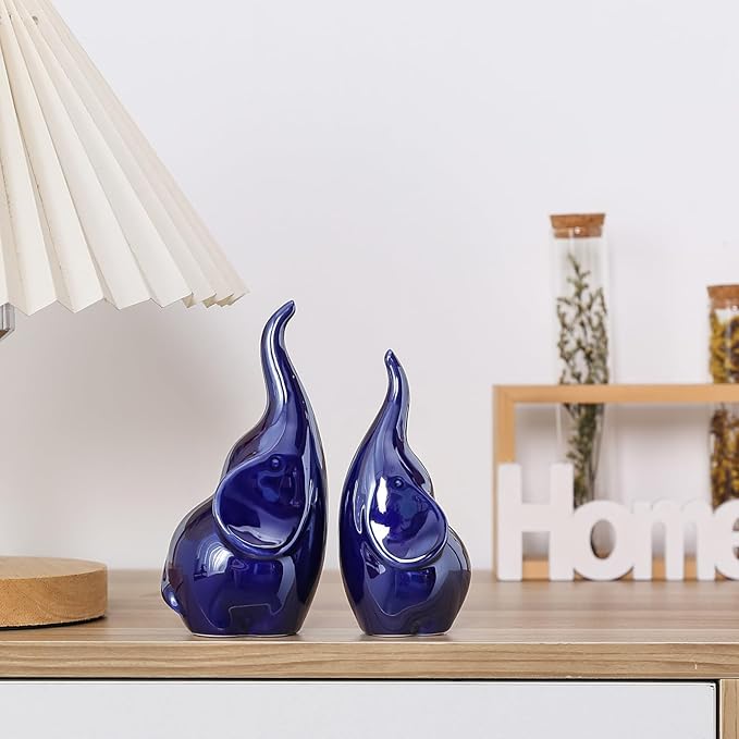 • [Symbol of Love and Loyalty] These blue ceramic elephant figurines beautifully symbolize love, loyalty, and good fortune. Designed as a couple with trunks raised high, these elephants convey a timeless story of unity and prosperity. Crafted in a minimalist style, the smooth ceramic finish adds a modern elegance, making them perfect for elephant decor for home or elephant sculptures for home decor. Their compact sizes—5.5 inches (14 cm) and 4.72 inches (12 cm)—make them an ideal fit for shelves, desks, or bedside tables.