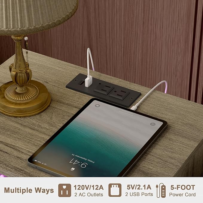 • Charge-Up Is Easy: Introducing the JOONEE small nightstand, the answer to outlet scarcity! With its two AC power outlets and two USB connections, this bedside table can meet all of your charging demands. Additionally, this modern nightstand's strategically positioned outlets charge numerous gadgets effectively and without disturbance.
