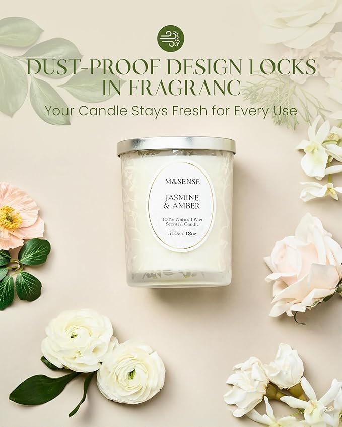 M&SENSE Jasmine Amber Candle, Cracking Wooden Wick Soy Wax, 18oz 100 Hours Long Lasting Clean Burn, Large Jar Candles for Home Scented, Non-Toxic Relaxing Aromatherapy Gifts for Women