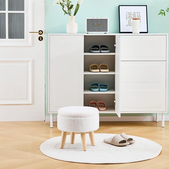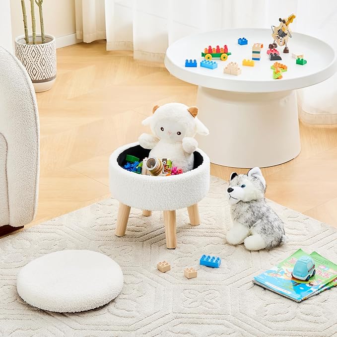 Mxfurhawa Versatile Storage Ottoman, Round Footstool with Soft Padded Seat, Small End Table with 4 Wood Legs, Teddy Velvet Foot Rest for Couch,Shoe Changing Stool for Living Room (Cream)