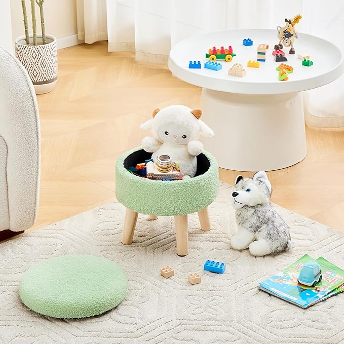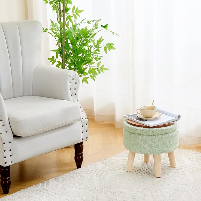 Mxfurhawa Versatile Storage Ottoman, Round Footstool with Soft Padded Seat, Small End Table with 4 Wood Legs, Teddy Velvet Foot Rest for Couch,Shoe Changing Stool for Living Room (Light Green)