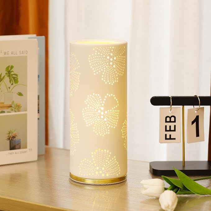 Small Modern Ceramics Bedside Table Lamp, 4.5 x 4.5 x 11 Inch White Flowers Style Nightstand Lamps, Side Table Lamps for Bedroom Living Room Entryway Table Light