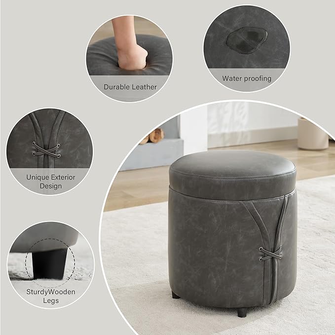 16.5 inch PU Leather Small Round Storage Ottoman, Modern Upholstered Ottoman with Soft Padded Seat, Chic Round Vanity Foot Stool with Removable Lid,Grey