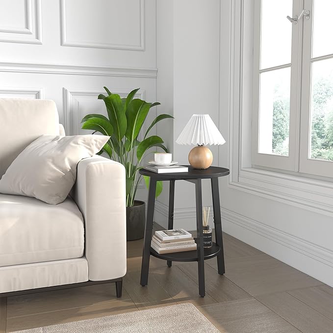 Side Table, Small Round End Table with Storage Shelf for Small Space, 2-Tier Black Bedside Table Sofa Couch Table, Round Accent Table Nighstands for Living Room, Bedroom, Black